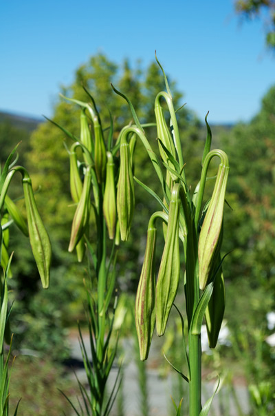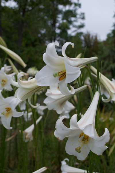 The Formosa Lily (Lilium formosanum) shows a remarkable signature in the way the flower blooms. The buds form upright, then reflex downwards as they mature. The buds then rise again to bloom outwards like trumpets. Once the bloom has finished the seed pod develops pointing upwards again.
